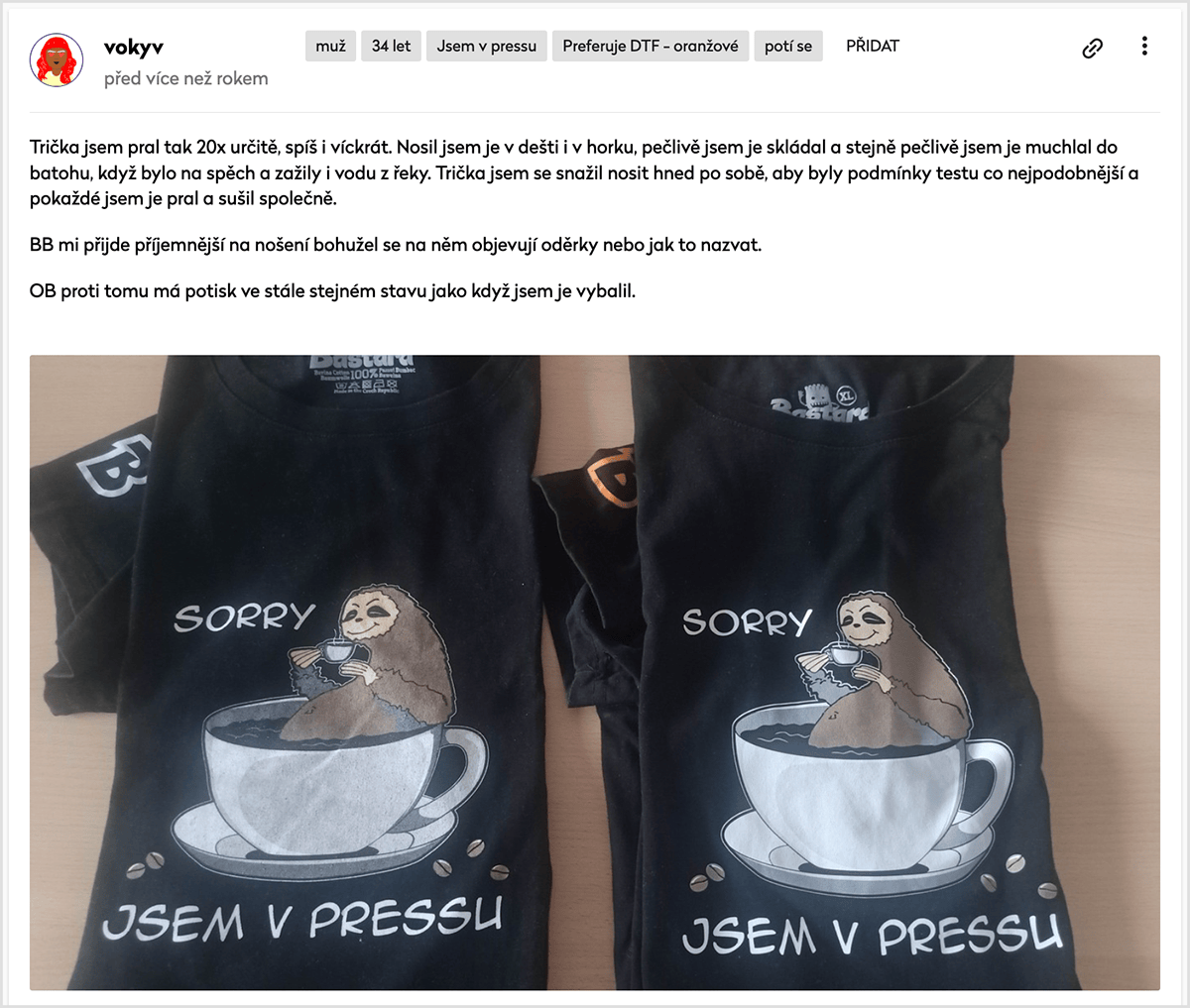 Testování trvalo přibližně čtvrt roku. Všechna trička prošla desítkami praní, některá skončila i v sušičce, další se nosila několikrát týdně. Zajímalo nás všechno – blednutí barev, popraskání potisku, změna povrchu na omak i celkový vzhled po delší době.